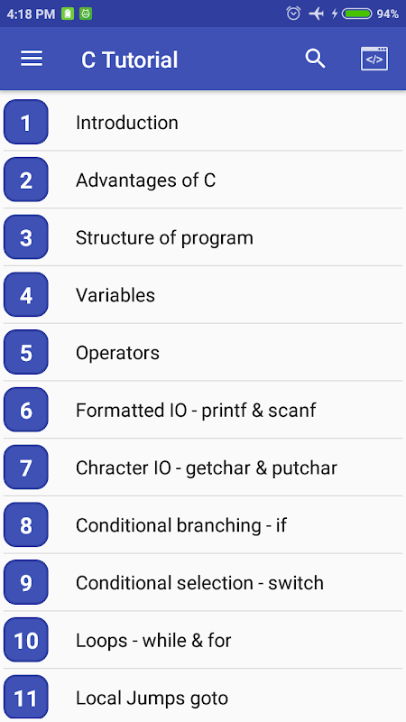 App contient des didacticiels et des programmes simples pour apprendre la programmation C.