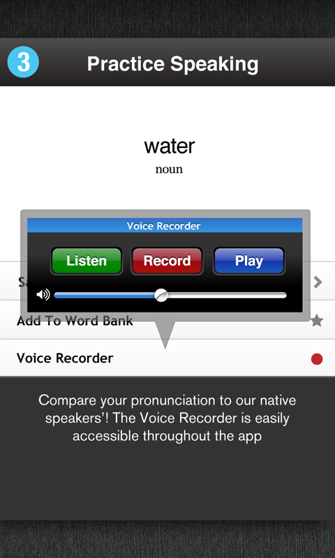 - Perfect your Pronunciation: Compare your pronunciation to the native speaker's with the Voice Recorder, easily accessible throughout the app