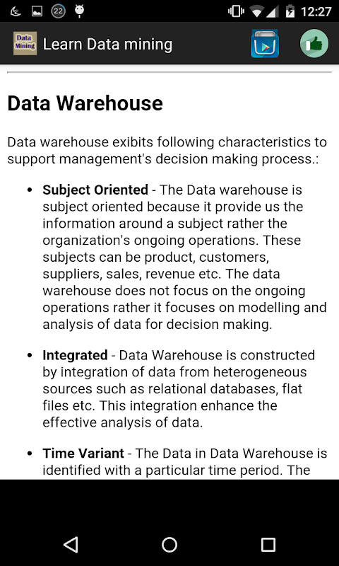 With this app help you understand the basic to advanced concepts related to Data Warehousing.