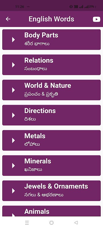 Présentation de "Apprendre l'anglais à travers le télougou", une application complète d'apprentissage des langues conçue spécifiquement pour les locuteurs de télougou qui souhaitent améliorer leurs compétences en anglais. Cette application conviviale et interactive est équipée d'une multitude de fonctionnalités et d'outils pour rendre l'expérience d'apprentissage agréable et efficace. Que vous soyez un débutant ou un apprenant avancé, cette application s'adresse à tous les niveaux de compétence, vous permettant d'apprendre à votre propre rythme.