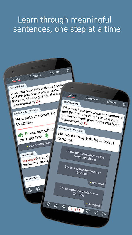 L'application utilise la capacité naturelle de votre cerveau à apprendre les langues en répétant des modèles pertinents spécifiques à la langue allemande.