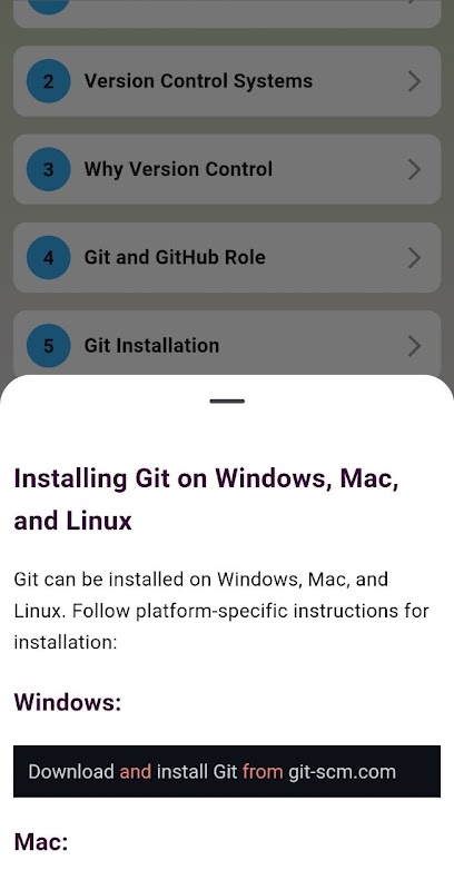 • Explications étape par étape : chaque sujet est expliqué étape par étape, ce qui permet aux apprenants de suivre et d'implémenter facilement les commandes Git dans des scénarios réels.