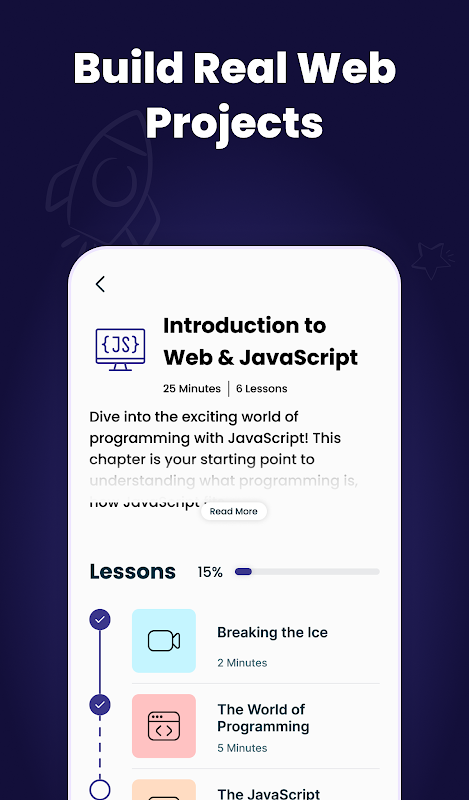 - Apprentissage interactif : explorez JavaScript et le développement web avec des quiz, des blocs de code interactifs et des défis amusants.