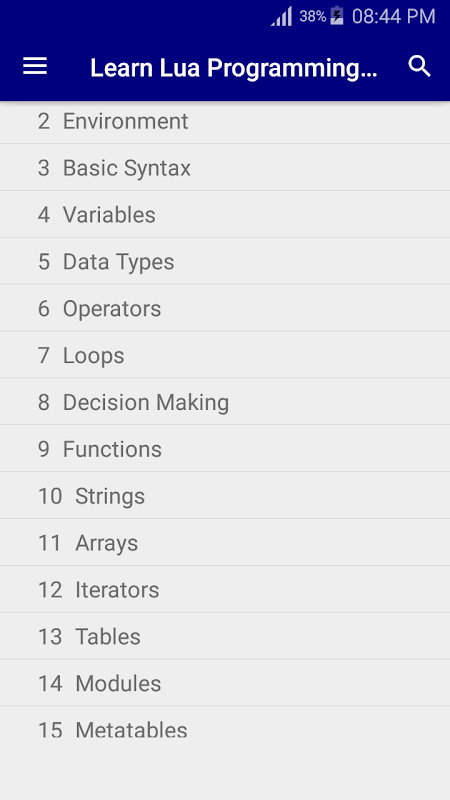✓ Lua Basics Tutorial: Environment,Basic Syntax,Variables,Data Types,Operators,Loops,Decision Making,Functions,Strings,Arrays,Iterators,Tables,Modules,Metatables,Coroutines,File I/O,Error Handling