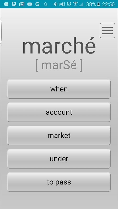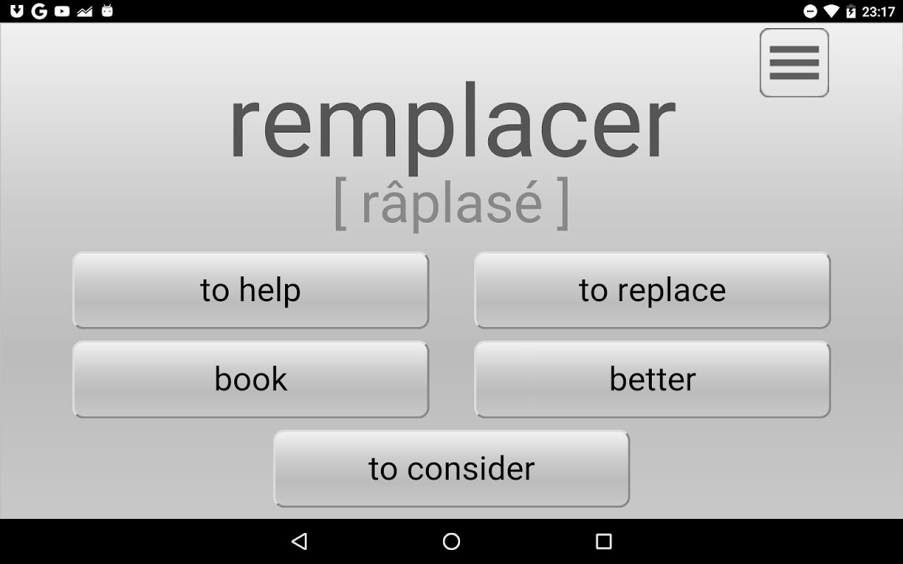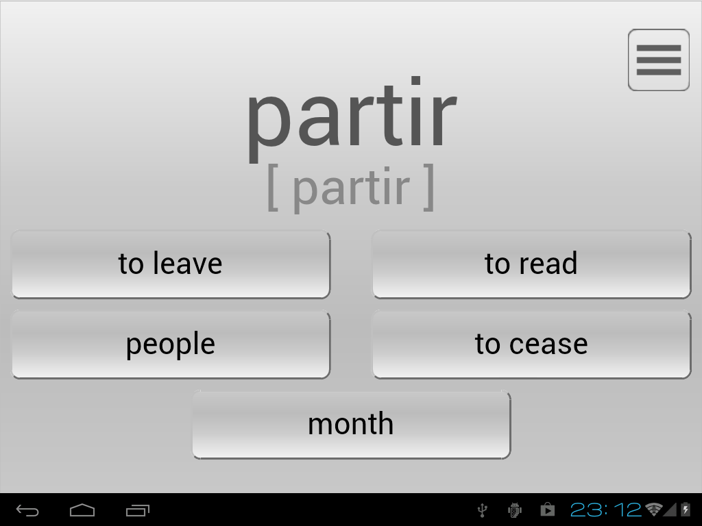 Le programme affiche un mot français aléatoire, ainsi que ses variantes et une traduction en anglais (ou en russe). Un guide de prononciation apparaîtra également sous le mot pour vous aider à apprendre à le dire correctement. Le programme continuera de vous montrer chaque mot français, jusqu'à ce que vous réussissez à apprendre. L'application considère que vous avez intériorisé et appris un mot que vous avez traduit correctement cinq fois de suite, et ensuite prendre ce mot sur le cycle d'apprentissage.