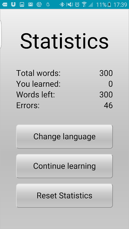 L'application dispose d'un menu de statistiques qui montre combien de mots que vous avez appris, combien de mots vous reste à apprendre, et combien d'erreurs que vous avez fait et êtes autorisé à faire avant que les mots français sont considérés comme ayant été appris. Vous pouvez réinitialiser les données statistiques, changer la langue de l'application, ou réinitialiser le processus d'apprentissage de la langue française à tout moment.