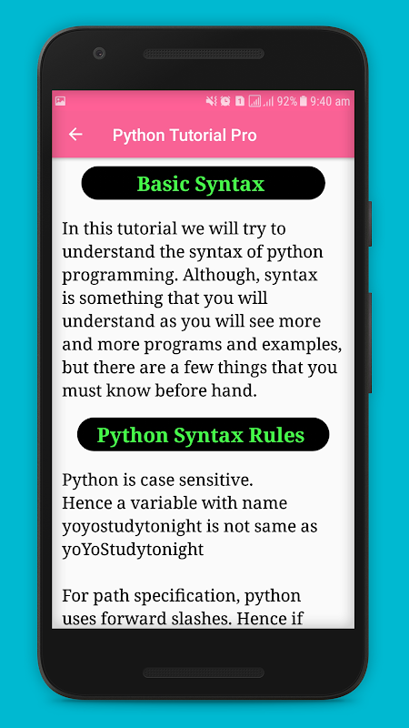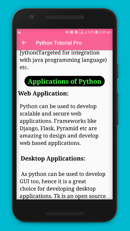 of this Python Programming Tutorial application.all the basic java of are explain very well and explain every basic Python Programming Tutorial