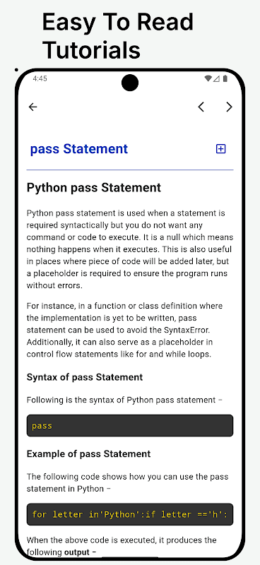 Cette application vous fera passer de débutant à expert en Python, facilement et intelligemment. Nous avons conçu chaque élément de contenu pour qu'il soit concis et simple, sans jamais vous laisser perplexe.