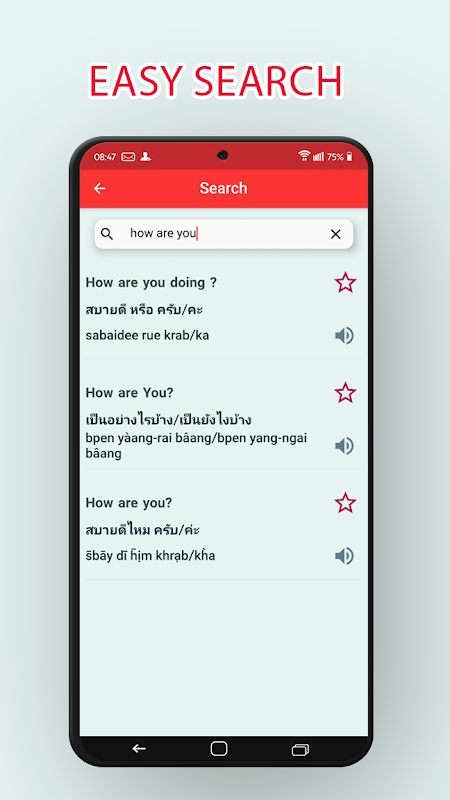 Cette application contient plus de 1500 phrases et vocabulaires thaïlandais couramment utilisés pour les voyageurs et les débutants, divisés en 32 catégories.