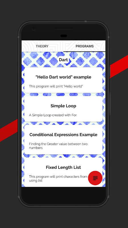 Cette application confère avec une variété de langages de programmation. Tels que C ++, Java, Kotlin, Python, PHP et Dart. Cette application est créée pour aider à améliorer la réflexion sur divers problèmes associés à la programmation. Il consiste à programmer des langages par leurs sujets et leur code source.