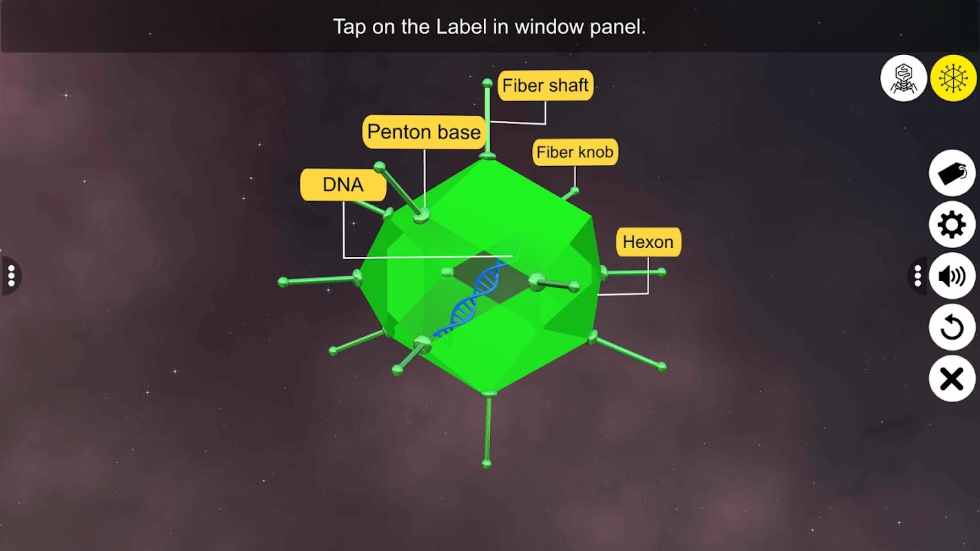 Cette application dispose de deux modèles 3D liés aux virus. Vous pouvez voir les informations de chaque modèle en appuyant sur les étiquettes des fenêtres, ce qui aide l'utilisateur à en savoir plus sur les virus. Cette application peut être utile pour les étudiants et les enseignants sur l'étude des virus. Vous pourrez mieux voir ce modèle en ange 3D en effectuant un zoom avant, un zoom arrière et une rotation, afin que vous puissiez mieux en savoir plus sur sa partie. Ainsi que ceux qui veulent faire une étude liée aux virus, cette application peut être utile.