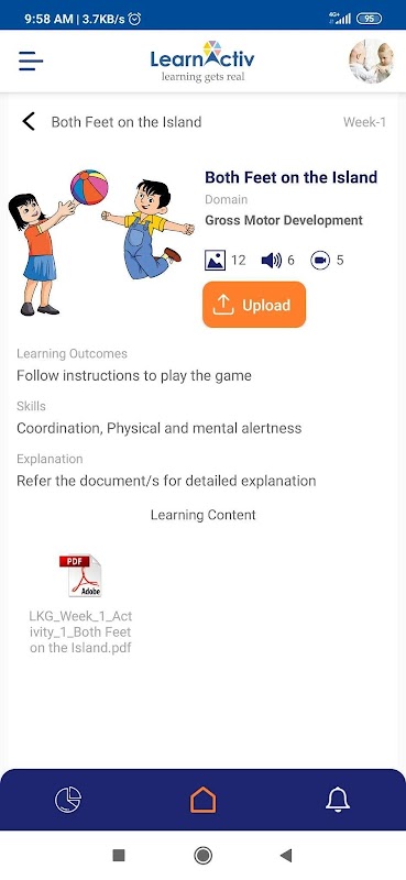 This APP is part of a larger product LearnActiv developed by Early Childhood Care and Education experts to help parent homeschool their 3 to 6 yr old. Parent who purchase this product will be getting recommended activities through the APP in the form of pdf, video, interactive and audio files. Parents can upload the evidence through the APP after executing the activities with the support of resources provided in the APP. The ECCE experts will look at uploaded evidence and share their feedbacks to parents orally over a call and also in the form of a monthly report. Parents are allowed to upload evidence in the form of MP4,image and audio format. This APP also provides notifications to the parents.