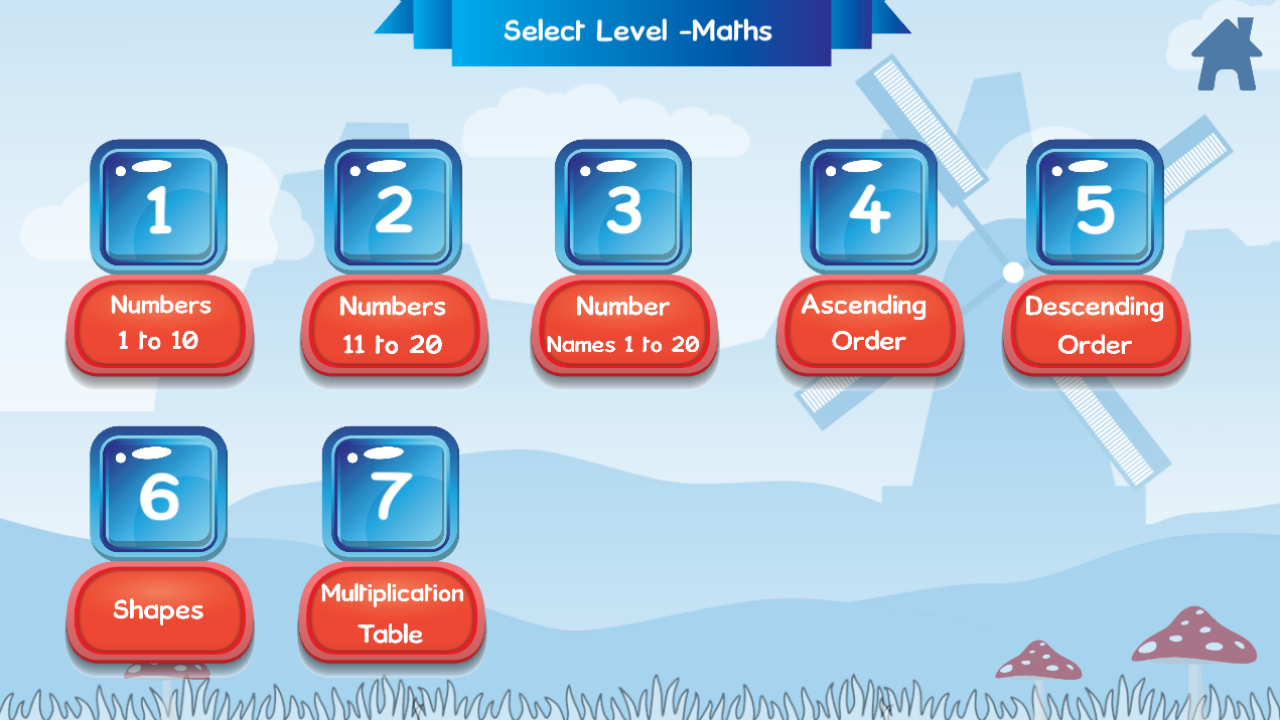 2. Maths contient également de nombreux niveaux, vous pouvez sélectionner l'option comme les nombres 1 à 10, les nombres 11 à 20, les noms des nombres 1 à 20 avec l'orthographe, l'ordre croissant, l'ordre décroissant, différents types de formes avec des noms et la table de multiplication également.