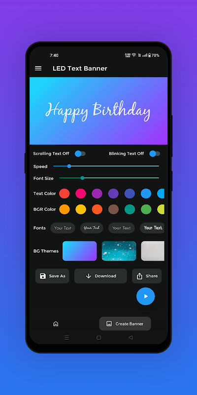 Avec un large éventail de personnalisations, notamment des couleurs, des polices, des animations et des thèmes, vous pouvez rendre votre bannière aussi unique que votre message. Partagez vos créations avec des amis, enregistrez-les sur votre téléphone ou affichez-les en mode plein écran pour un impact maximal.