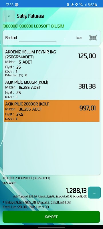 Facture de vente, connaissement de vente, connaissement de vente logistique, facture électronique, facture électronique d'archive, connaissement électronique, espèces, point de vente, chèque, transactions de collecte de billets à ordre, collectes de points de vente virtuels, paiements de dépenses, transactions bancaires en espèces, chargement et déchargement de véhicules, Il fournit des contenus tels que les transferts d'entrepôt, les bordereaux de comptage, le positionnement client, les rappels et les rapports. Il convient au travail en ligne et hors ligne avec la méthode de synchronisation. Comprend des options de sortie pour les imprimantes matricielles et thermiques.