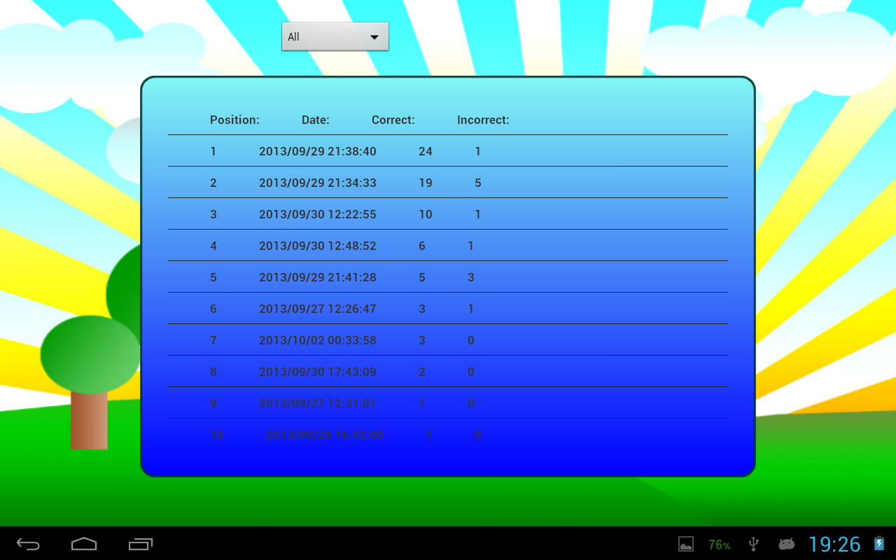 Il ya aussi une liste classant les scores de savoir que vous avez réalisé. En outre, les résultats peuvent être filtrés et ne voient que les scores du filtre sélectionné. Ex: Les 10 meilleurs, 10 pire ...