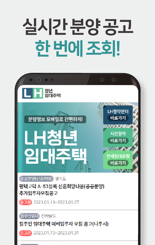 2023 LH Youth Rental Housing, Youth Jeonse Lease, Youth Housing, Abonnement, etc. Vérifiez rapidement le contenu des ventes/abonnements et des annonces de vente en temps réel avec des notifications ! Vous pouvez facilement trouver toutes les informations que vous souhaitez connaître à partir de l'application LH Youth Rental Housing sur votre mobile.