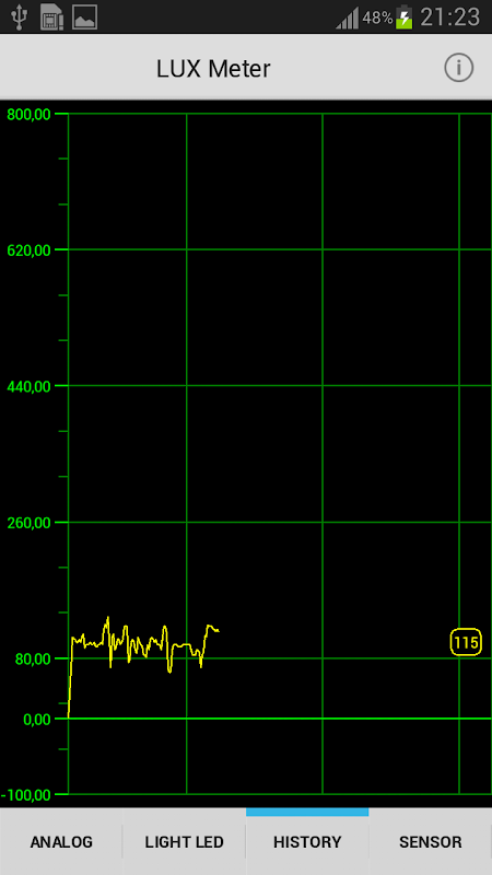 Pour augmenter la précision d'un facteur d'étalonnage peut être réglé. Lux mètre fournit tous les capteurs de lumière de votre appareil prêt pour la mesure, ceux-ci sont affichés en conséquence et sont sélectionnables si votre appareil dispose de plusieurs capteurs.