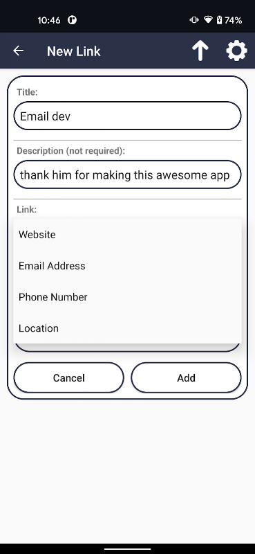Découvrez LinkBoard, une application simple et intuitive qui vous permet d'enregistrer des liens vers des sites Web, des adresses e-mail, des emplacements et des numéros de téléphone pour plus tard ! Chaque lien est affiché sous la forme d'une carte qui peut se voir attribuer un titre, une description et une catégorie. Appuyez simplement sur une carte pour visiter un lien, maintenez la pression pour la partager et glissez pour la supprimer !