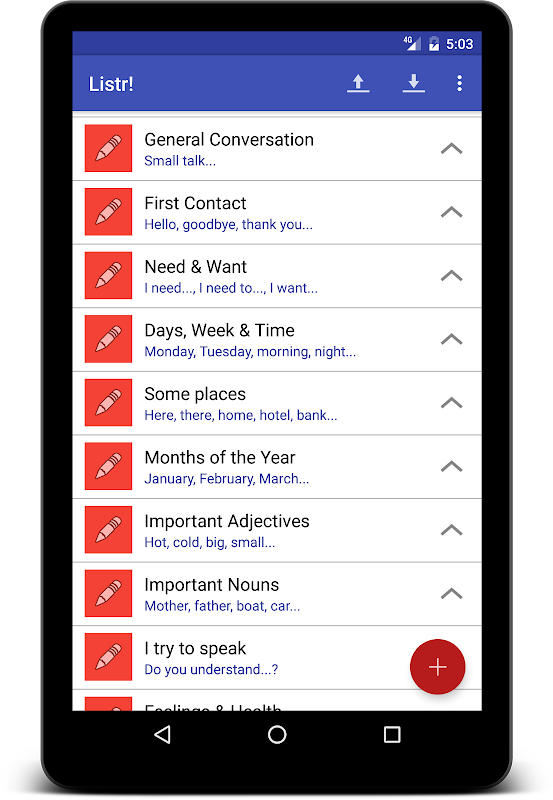 FREE! You may download a sample list-file to your phone's Download folder (no Dropbox account or Sign-in required!). You can import this file using Listr! and edit it there to serve your own needs. https://www.dropbox.com/s/albylc2vzguhplk/db_categories_kh.json?dl=0