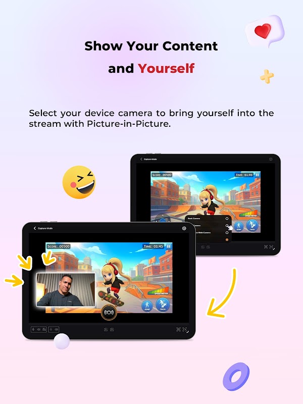 Montrez-vous et votre contenu : Utilisez le mode Picture-in-Picture (PiP) pour partager votre écran et votre caméra ensemble — parfait pour le gameplay, les tutoriels ou les démos.
