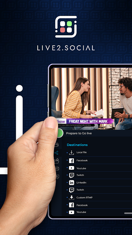 Live2.Social fonctionne avec vos appareils Android ou IOS, capturez des vidéos sous plusieurs angles de caméra simplement en connectant votre smartphone ou votre tablette sur la même connexion Wi-Fi ou choisissez des caméras distantes - et modifiez-les en temps réel -