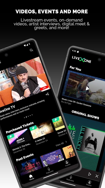 LiveOne est le lieu de diffusion en direct de performances et d'interviews de certains des plus grands artistes, concerts et festivals du monde, notamment Rock In Rio, Spring Awakening, ALTer EGO et la propre franchise Music Lives de LiveOne.