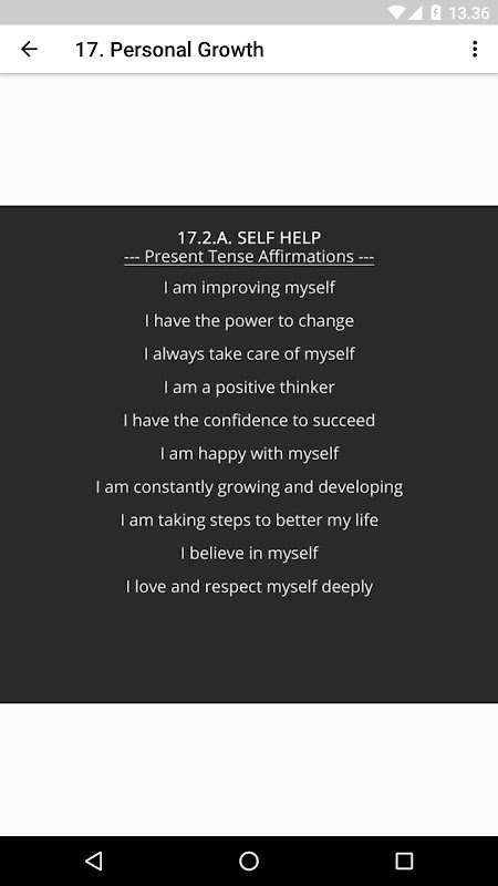 Features: quick and easy navigation, user friendly interface, affirmation categories, present tense affirmations, future tense affirmations, natural affirmations.
