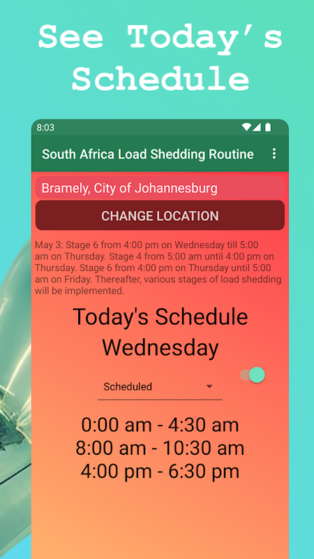 Restez informé, restez préparé et luttez efficacement contre le délestage avec l'application Load Shedding Schedule. Téléchargez maintenant et prenez le contrôle de votre expérience de panne de courant en Afrique du Sud.