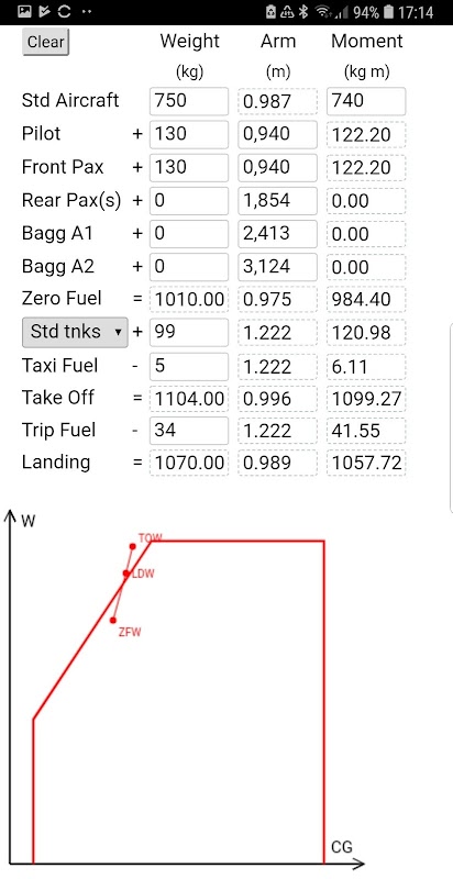 Entrez simplement les différentes valeurs de poids pour le pilote, les passagers, les bagages et le carburant.