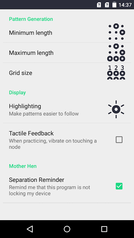 - Direct button for Android Security Settings to apply Pattern.