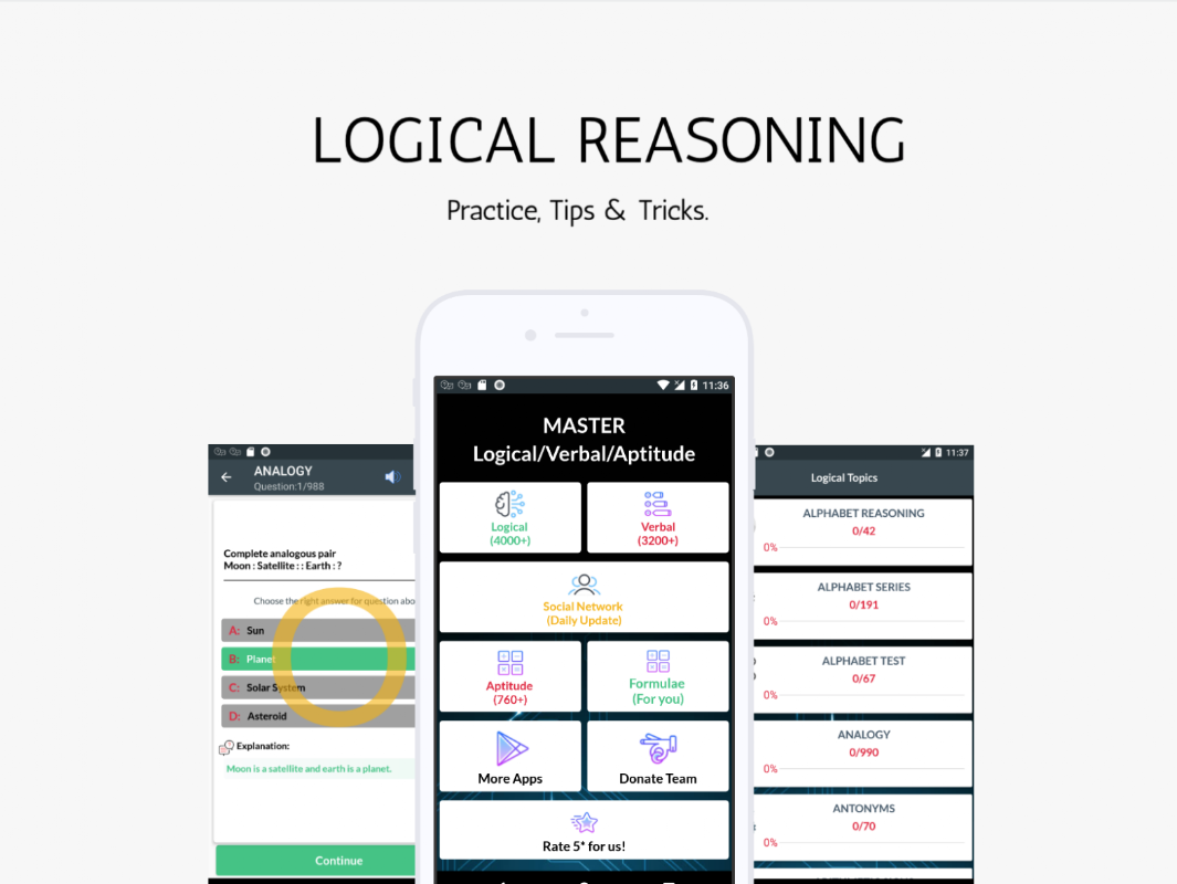 - Plusieurs catégories : choisissez parmi le raisonnement logique, le raisonnement verbal, l'aptitude et le mode test (tests en ligne, tests quotidiens, etc.).