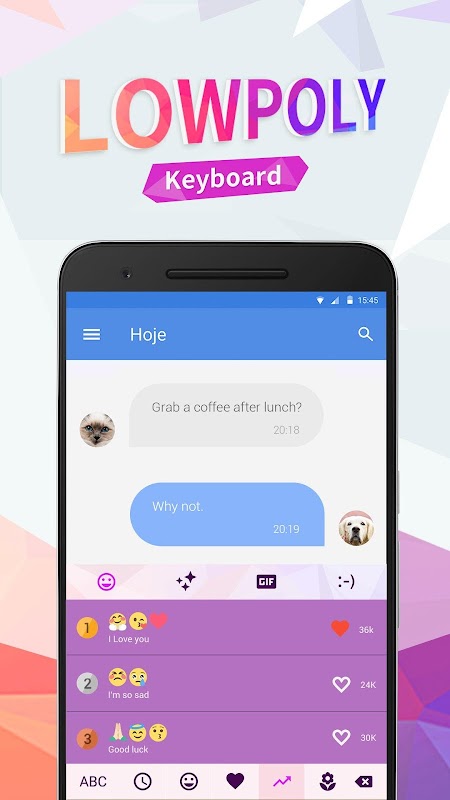 With a help of ♥Low Poly Emoji Keyboard Theme ♥ you can dress up your device with numerous elegant themes.Our theme is designed to change the appearance of your keyboard in a fashionable and beautiful way. It can be used to type on SMS, Facebook, Twitter, Instagram, Messenger, Gmail, WhatsApp and any other social apps directly from this emoji app.
