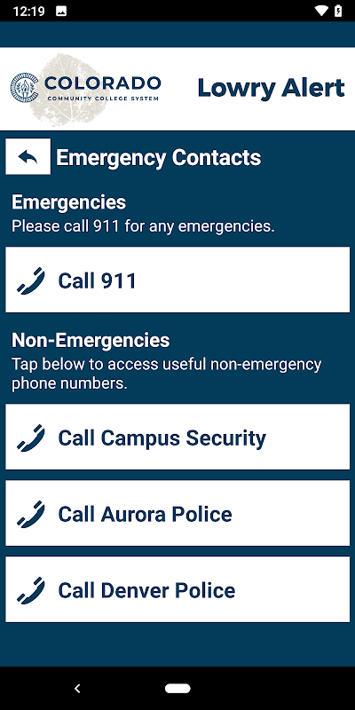 Lowry Alert is the official safety app of Colorado Community College System - Lowry Campus. It is the only app that integrates with CCCS Lowry's safety and security systems. Campus Security has worked to develop a unique app that provides students, faculty and staff with added safety on the CCCS Lowry campus. The app will send you important safety alerts and provide instant access to campus safety resources.
