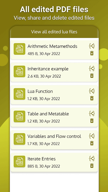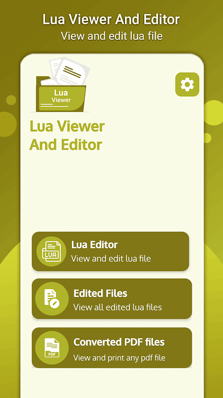 Lua Viewer est une application de lecture rapide, légère et facile à utiliser que vous pouvez utiliser pour lire et convertir n'importe quel fichier lua en fichier pdf sur votre appareil sans perte de code. Vous pouvez directement imprimer le fichier pdf. Vous pouvez également utiliser l'application pour afficher les fichiers pdf enregistrés sur votre appareil. Tous les fichiers modifiés de la visionneuse lua sont enregistrés dans l'appareil et sont visualisés dans l'application pour l'ouvrir directement dans l'éditeur.