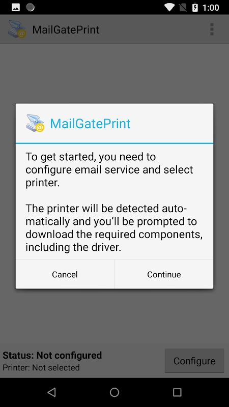 You can interact with MailGatePrint on the device, or via email in case the device does not have screen and keyboard, or is not easily accessible. You can even use Raspberry Pi or other similar IoT device running Android Things. Every time your action is required, you’ll receive an email to respond to.