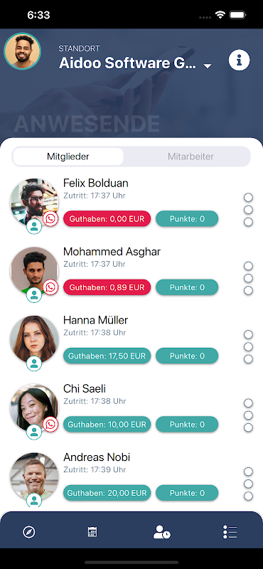 Les employés peuvent facilement enregistrer leurs heures de travail, les formateurs peuvent appeler et modifier les rendez-vous avec les membres. Quels sont les rendez-vous à venir aujourd'hui ? La semaine est-elle déjà complète ou réservée de manière optimale ? En cliquant sur le symbole de rendez-vous, vous appelez directement votre propre calendrier. Toutes les informations importantes sur le rendez-vous sont alors visibles dans la vue détaillée : durée du rendez-vous, informations importantes sur le rendez-vous et le membre ainsi que les données du membre avec photo et bien plus encore. Un coup d'œil à l'application Aidoo Software Company révèle également directement qui est actuellement dans le studio, bien sûr avec des détails, de sorte qu'un rendez-vous direct est également possible.