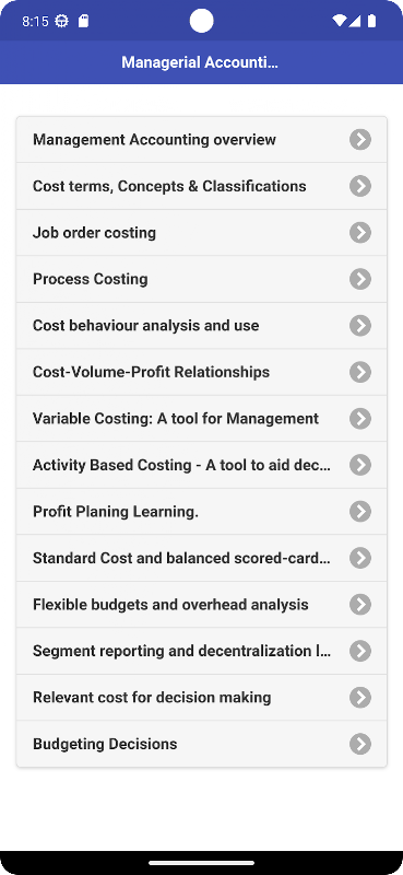 Notes de cours de comptabilité de gestion et matériel d'étude réunis en un seul endroit pour les étudiants. Apprenez l'identification, la mesure, l'analyse et l'interprétation des informations comptables pour la prise de décision interne. Cette application vous aidera à préparer les examens. Pour votre commodité, cette application comprend également toute la terminologie essentielle de la comptabilité de gestion. Vous pouvez ainsi apprendre et mémoriser facilement tous les termes essentiels de la comptabilité de gestion.