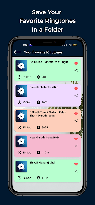 L'application de sonnerie Marathi possède une énorme collection de chansons et de sonneries musicales Marathi avec une qualité audio HD. nous avons sélectionné les meilleures chansons populaires de Marathi comme sonneries pour vous.