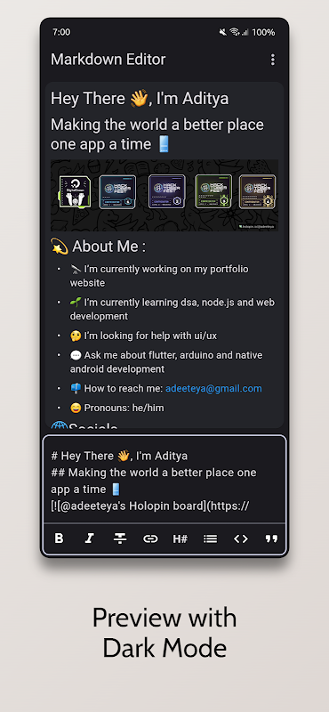 Le code source de cette application est disponible à l'adresse https://github.com/adeeteya/FlutterMarkdownEditor