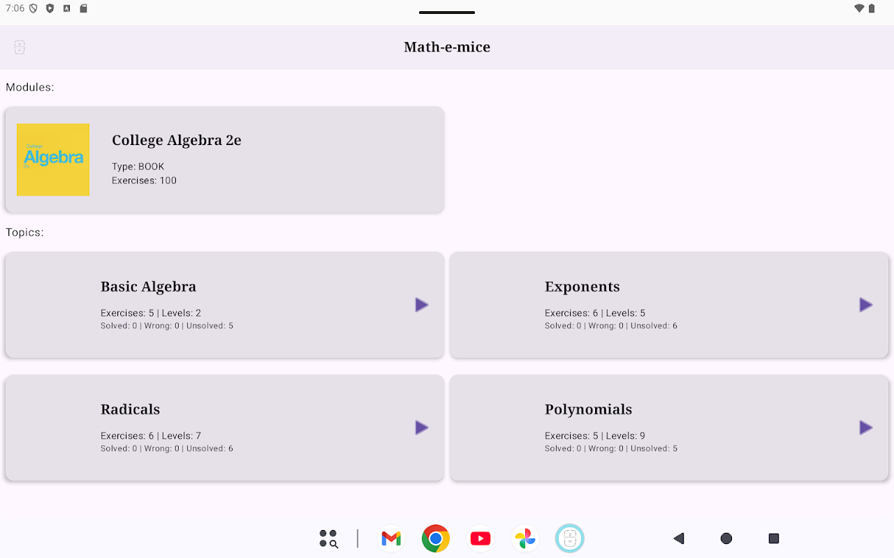 Cette application est encore en développement. Nous sommes dans la phase initiale de sa création. Pour le moment, considérez-la comme une démo. Cependant, vous apprécierez peut-être déjà certains exercices mathématiques.