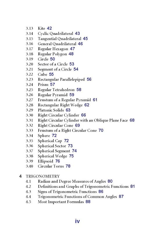 Ce manuel (par Alex Svirin Ph.D.) est une référence de bureau complète pour les étudiants et les ingénieurs. Il a tout, des mathématiques du secondaire aux mathématiques pour les étudiants de premier cycle avancés en ingénierie, économie, sciences physiques et mathématiques. L'ebook contient des centaines de formules, de tableaux et de figures tirés des ensembles de nombres, de l'algèbre, de la géométrie, de la trigonométrie, des matrices et des déterminants, des vecteurs, de la géométrie analytique, du calcul, des équations différentielles, des séries et de la théorie des probabilités. La table des matières structurée, les liens et la mise en page permettent de trouver rapidement et facilement les informations pertinentes, de sorte qu'elles peuvent être utilisées comme guide de référence en ligne au quotidien.
