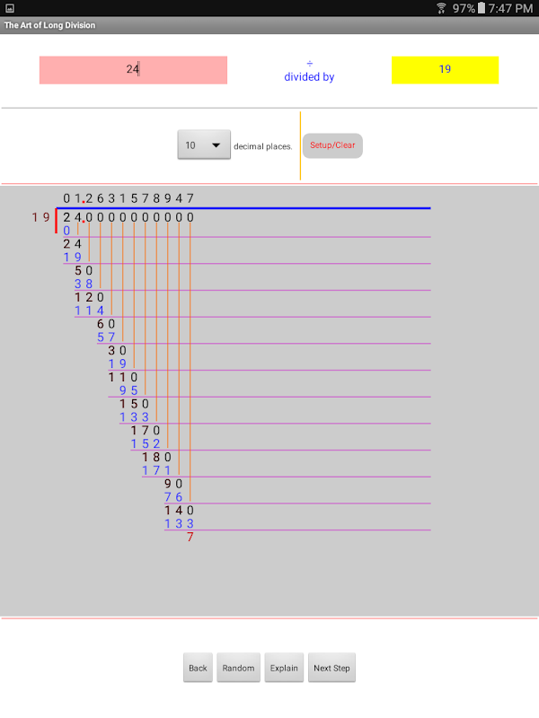 Long division is among the most notorious topics in school mathematics. However, it is also one of the most fruitful topics that allow children to have fun with mathematical thinking, if it is explored in a meaningful way. It combines addition, subtraction, multiplication, and, of course, division in a network of number senses. The key is balancing the procedures and the concepts behind the long process and allowing children to talk about the ideas and the patterns. Once children learned to enjoy the art and joy of long division, they may have a better experience with the mathematics that follow. And, yes, they should be allowed to use calculators for quick solutions later on. This app was inspired by two seven-year-olds I worked with about long division in late 2016. They enjoyed the art of long division and kept asking for more problems and sharing the patterns they discovered. Importantly, long division should not be forced on school children; but it can be a pleasurable experience for them to play with mathematics. There are, of course, other variations of the long division format.