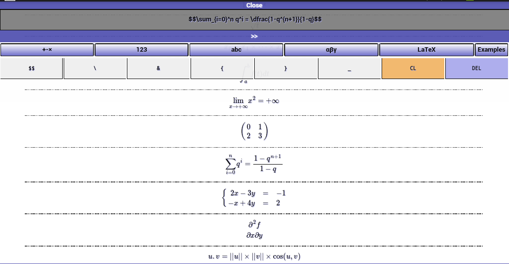 Les formules doivent être écrite à l'aide de la syntaxe LaTex, mais pas d'inquiétude, les principales sont décrites et expliquées dès le début de l'application. On trouvera également un éditeur complet de formules.