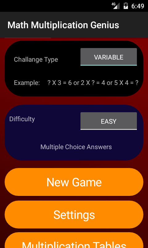 + Défi variable : dans ce mode, l'application sélectionne une série de questions de multiplication et demande à l'utilisateur de trouver un multiplicateur pour obtenir une réponse spécifique ou de fournir la réponse à une question de multiplication.