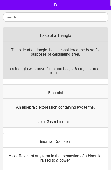 Fonctionnalité de recherche : cette application de dictionnaire mathématique dispose d'une fonction de recherche. Trouvez rapidement les termes que vous recherchez grâce à notre puissante fonction de recherche. Que vous ayez besoin de rechercher un terme spécifique ou d'explorer des concepts associés, notre application facilite la navigation dans une richesse de connaissances mathématiques.