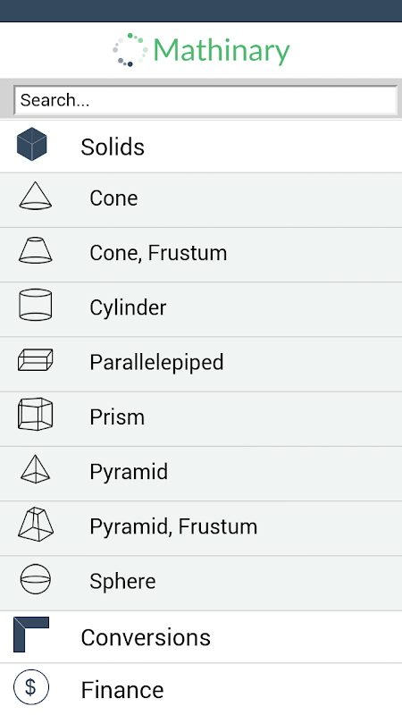 Cone, frustum cone, cylinder, parallelepiped, prism, pyramid, frustum pyramid, sphere