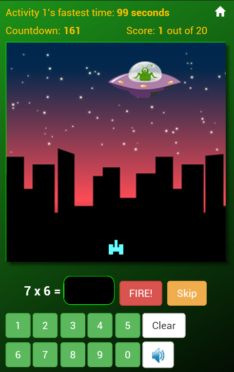 Another activity in this app is a multiplication activity which is a game that will help develop skills in multiplication using an alien invasion theme. Answer all 20 questions correctly within the set time period to save the city from alien invasion.