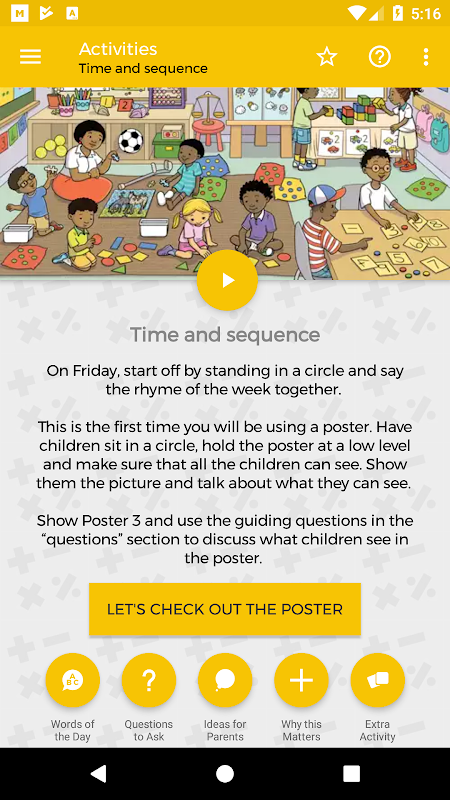 Des histoires et des comptines sont enregistrées pour une écoute facile en préparation à la lecture aux enfants. Les activités suggérées encouragent un enseignement et un apprentissage actif et basé sur le jeu et la navigation conviviale donne un accès rapide aux affiches, aux activités et aux informations expliquant pourquoi il est important d'enseigner le contenu de la semaine. Un lien direct permet aux praticiens/enseignants de partager des informations dans l'application avec les parents, collègues et amis.