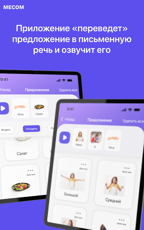 Mecom Communicator est une application mobile pour la formation de la parole et la communication non verbale. Il aide de manière ludique à maîtriser les compétences de communication et à accéder progressivement à une vie indépendante. L'application a été développée en collaboration avec des éducateurs professionnels qui se sont consacrés à travailler avec des personnes spéciales.